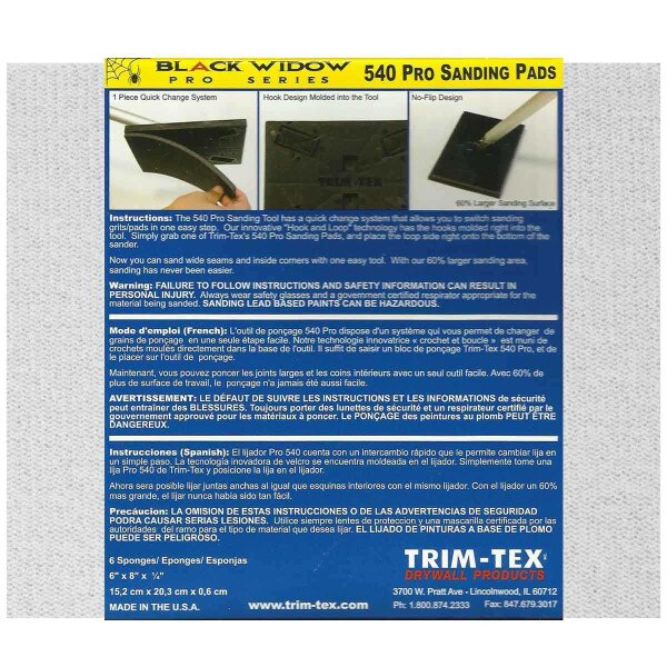 The all new Trim-Tex Black Widow Pads are a big improvement over the previous system. The abrasive lasts longer because it's bonded directly to the foam pad. Gone are the hard edges that scuff inside corners, and the consistent foam provides a perfectly surface for smoother sanding. Black Widow Sanding Pads attach with hook & loop directly to the Black Widow 540 Sander, and combine for an All-in-One foam and grit quick change system. The Black Widow Sanding System has a 60% larger sanding surface than traditional pole sanders - making your sanding jobs faster and easier. These high quality foam pads are Made in the USA.